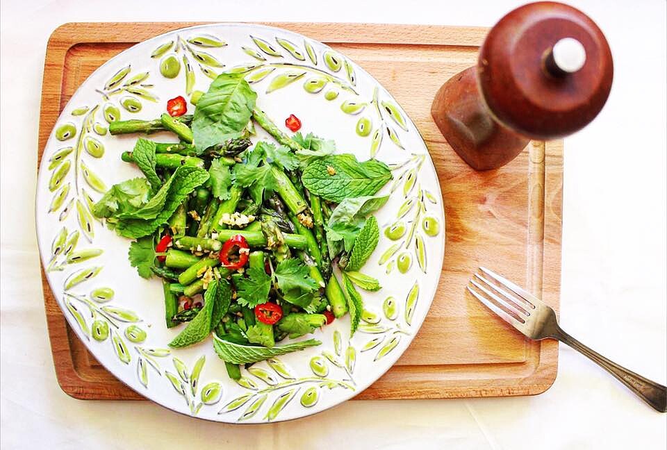 3. 將炒好的蘆筍裝盤,撒上新鮮羅勒、薄荷葉與香菜,趁熱享用。