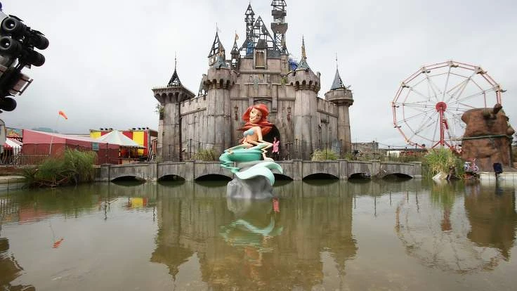 會把樂園主要宣傳標榜為「兒童不宜」的,大概也只有被翻譯為「迪士馬樂園」的 Dismaland 了,這裡是 Banksy 2015 年夏天在英國濱海韋斯頓(Weston-super-Mare)的廢棄海濱浴場設置的短期計畫,每個裝置作品和塗鴉都充滿了他所擅長的暗黑風格,充滿 Banksy 式的黑色幽默,也能看到他對社會及政治、難民議題的關注。