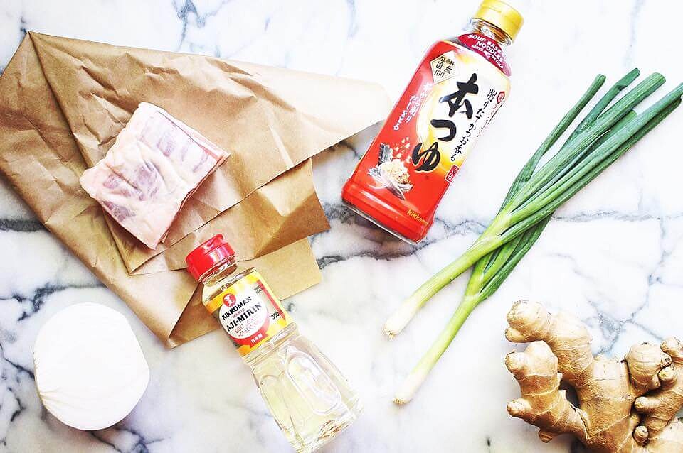 1.取一中碗,將柴魚醬油、薑泥與味霖攪拌均勻成醃醬,放入豬肉片醃至入味,大約30分鐘。