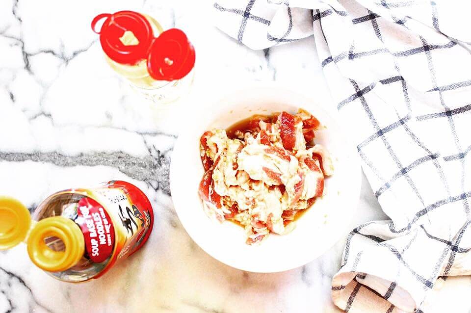 建議選用帶點油脂的豬肉(如肚子部位的肉)來做這道料理,比起瘦肉,帶油脂的肉片嚐起來更添豐厚。