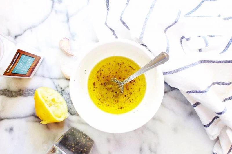 2. 取一小碗,將檸檬汁、橄欖油、鹽、黑胡椒、蒜泥攪拌均勻成沙拉醬。