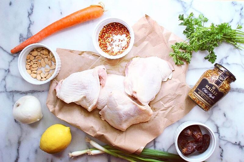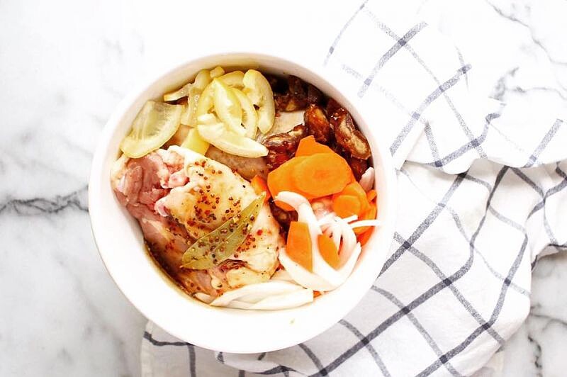 3. 取一大碗放入雞腿和步驟2完成的醬汁,再加入椰棗、洋蔥、紅蘿蔔和步驟1的檸檬片。將所有食材攪拌均勻,確認醬汁有包裹到每個食材,放置室溫下醃入味至少30分鐘。