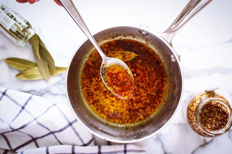 2. 取一小湯鍋,將檸檬汁、柳丁汁、蜂蜜、芥末籽醬、橄欖油、月桂葉、鹽、黑胡椒、紅胡椒片在鍋內攪拌均勻後煮滾,再轉小火滾約5分鐘熄火、降溫。