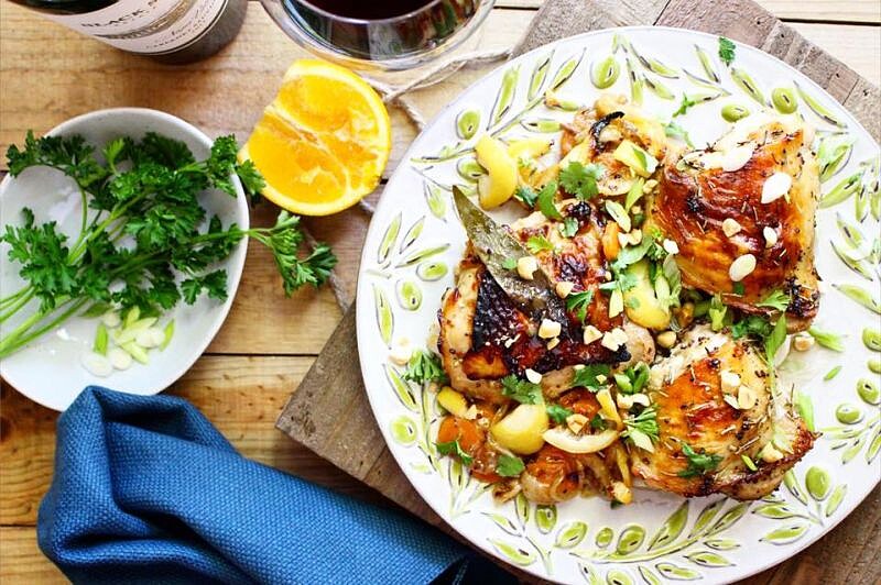 4. 烤箱預熱220℃(425℉),將所有食材和醬汁平鋪於烤盤上(雞皮朝上),烤約30-40分鐘,烤至雞腿肉熟透,且表面成金黃色。將烤雞與蔬菜盛盤,撒上香菜、巴西里、蔥段與花生即可享用。
