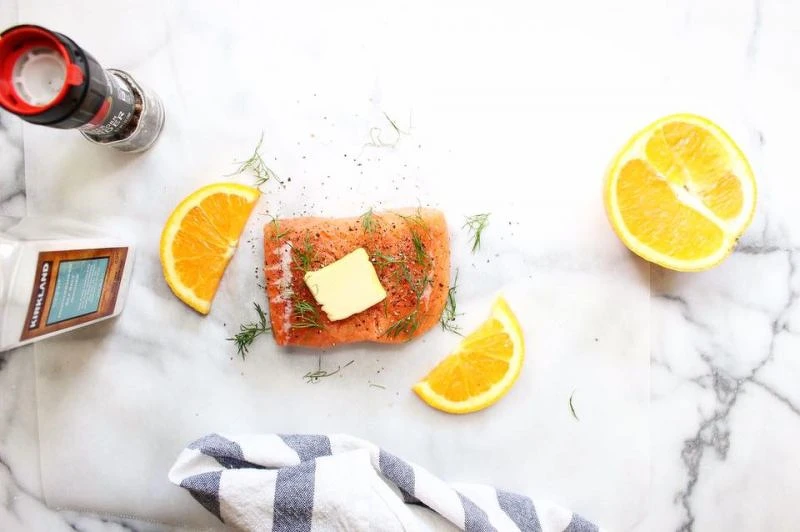 1. 烤箱預熱425℉(300℃)。裁兩張烘培紙,長和寬約為鮭魚排的3倍。將一片鮭魚放在烘培紙中央,均勻撒上適量鹽和黑胡椒,再放上1又1/2小匙的無鹽奶油、1大匙的蒔蘿、2片柳橙。