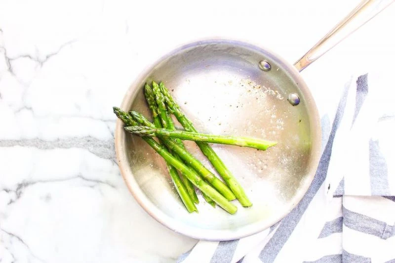 4. 鮭魚在烤的同時,將平底鍋以中火預熱,倒入橄欖油。蘆筍入鍋翻炒熟,至還保有一些脆度時起鍋,大約5分鐘。