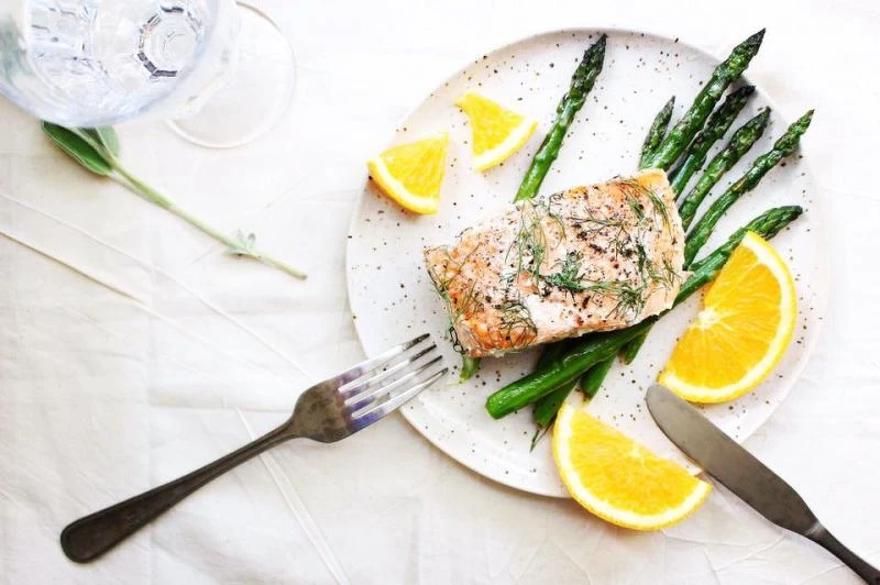 5. 將蘆筍平鋪於盤上,從紙包中取出鮭魚放於蘆筍上(小心熱氣燙手),擠上柳橙汁後即可享用。