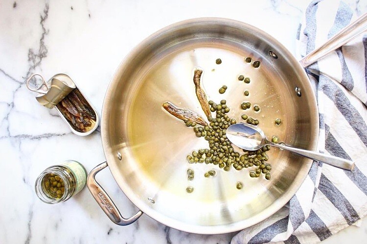2. 平底鍋以中大火預熱,倒入油後,加進鯷魚和酸豆,攪拌翻炒至鯷魚融化,大約3分鐘。