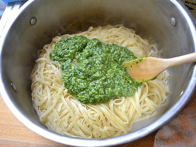 麵條瀝乾後再倒回鍋中,加入½ 杯預留的煮麵水及所有其它的配料拌勻。
