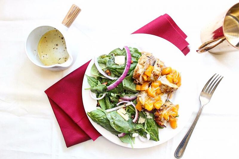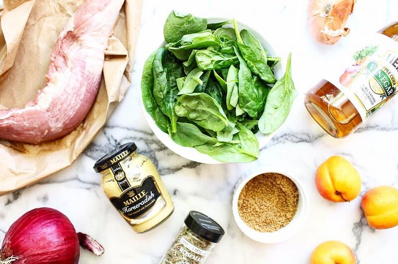 5. 將菠菜葉盛盤,撒上紅洋蔥、起司和開心果,淋上沙拉醬。將出爐的豬里肌靜置5分鐘後切片鋪在沙拉上,淋上之前預留的3大匙杏桃醬享用。
