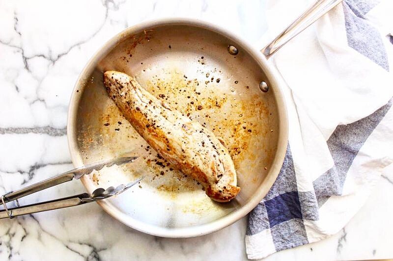 2. 將一可進烤箱的大平底鍋以中大火預熱。倒入剩下的1大匙油,提起鍋子轉一轉,讓整個鍋底都均勻覆蓋上油。將豬里肌肉撒上剩下的1/4小匙鹽、胡椒調味,入鍋,煎至每面都有漂亮的金黃色,大約6分鐘。