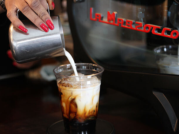 喜歡結合巧克力與咖啡香的摩卡嗎?這款作品會讓你恨不得把杯裡每滴都舔個精光!華盛頓特區的羅盤咖啡推出「Nutella 摩卡」,比起原先使用可可粉或是巧克力糖漿,咖啡店主人 Michael Haft 和 Harrison Suarez 發明自己的 Nutella 巧克力醬版本。首先,將 Nutella 巧克力醬加熱,他們特別喜歡使用加拿大販售的 Nutella ,因其使用真正的糖而非一般的高果糖玉米糖漿,再添加鮮奶油和全脂牛奶讓醬汁變薄,最後,撒上少許可可粉和香草精。羅盤咖啡的獨家食譜中,採用兩個 shot 的濃縮義式咖啡搭配 45 公克榛果巧克力醬,倒些熱牛奶做完美的結尾。