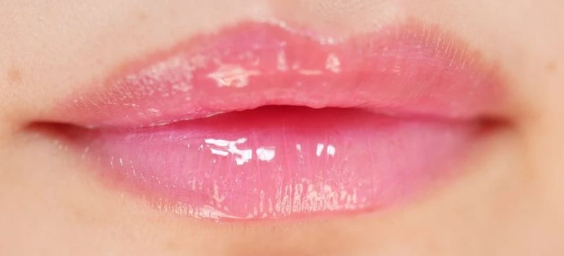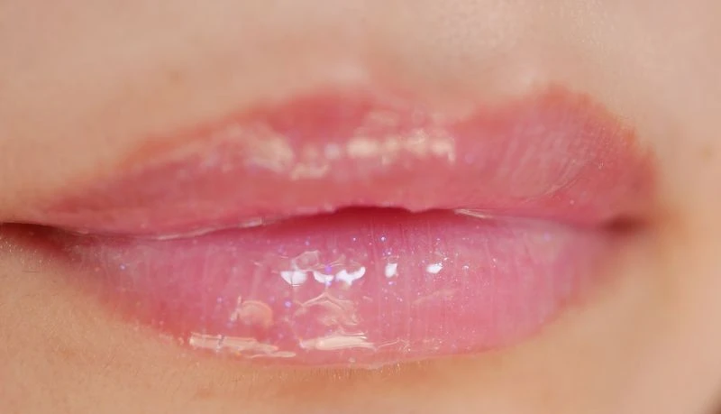 和只使用單色的效果截然不同。微白的珠光牛奶粉紅與唇膏相融合讓唇部整體呈現出亮白的質感。細小的彩色亮粉加分不少,讓嘴唇看起來更加立體水潤