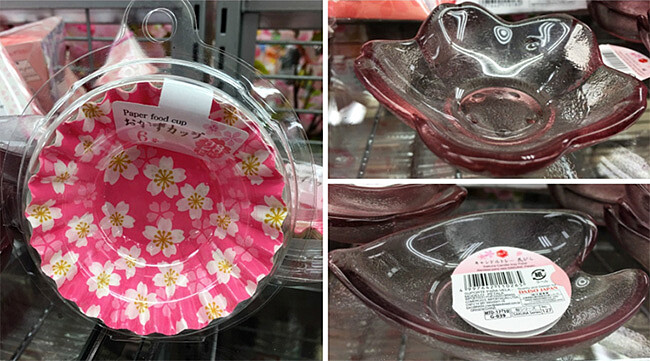 左圖為滿滿櫻花圖案的便當盛菜工具,在準備便當時有湯汁的菜餚常有溢出來的困擾,但使用這個小工具,除了可以避免湯汁撒出外,也讓便當更有春天的季節感。右上圖為整朵櫻花盛開造型的粉嫩玻璃小碟子,右下圖為櫻花花瓣造型的小碟子,兩款粉嫩透明的設計,相當受到主婦們的喜愛。