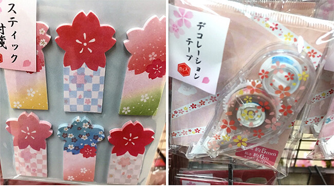 櫻花商品中也有不少的文具,其中挑選了2樣人氣的商品讓大家瞧瞧。左邊是6款櫻花花瓣設計的便條紙,很適合買來送給女生同事們,相信一定大受歡迎。右圖是類似櫻花圖案的滾輪膠帶,類似立可帶的設計,好用又方便。如果喜歡自製卡片的人,可以買這個櫻花膠帶做出獨一無二的卡片唷!