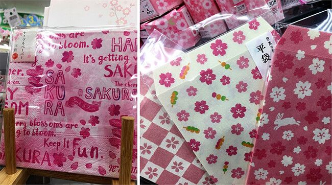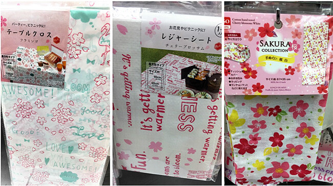 接下來是外出用餐系列商品,畢竟日本人在賞櫻季節是會在櫻花樹下烤肉或吃便當,所以大創也推出應景的櫻花圖案野餐商品。左邊開始是桌巾、野餐墊及便當包布。不論使用哪一個商品都超級有賞櫻的季節感,重點是價格才100日圓,真的十分划算。