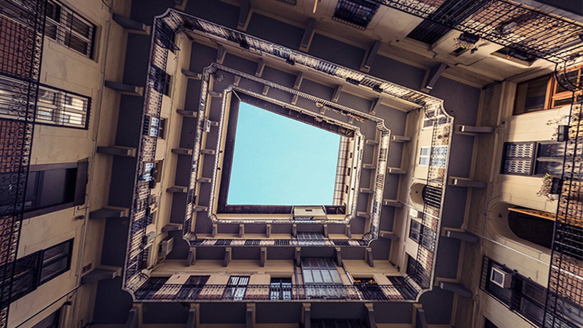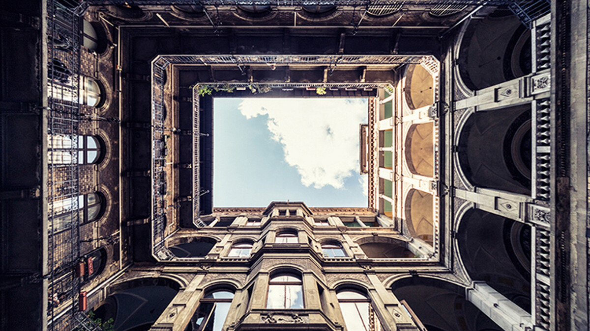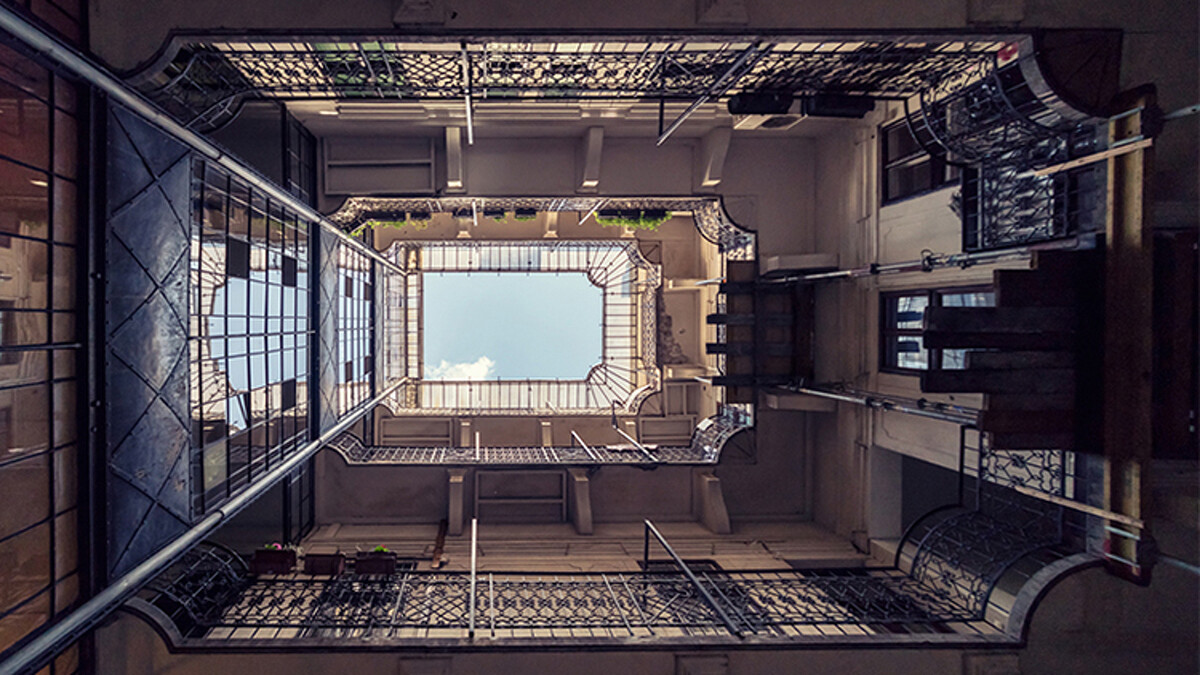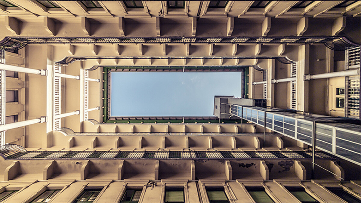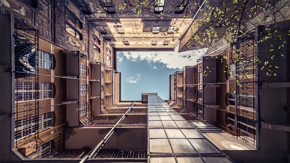 這一棟棟的建築物,有著歷史的痕跡,歐式的環狀住宅、斑駁的磚牆、老舊的電梯、被植物攀附的窗框,那些看來殘舊的畫面,當他站在建築物的中間仰頭望去,卻看見了難得一見的「一致性」。人們口中常說難以看見的整片天空,卻在他的鏡頭下,被框畫得完整清澈,而那畫框正是歷史的痕跡。