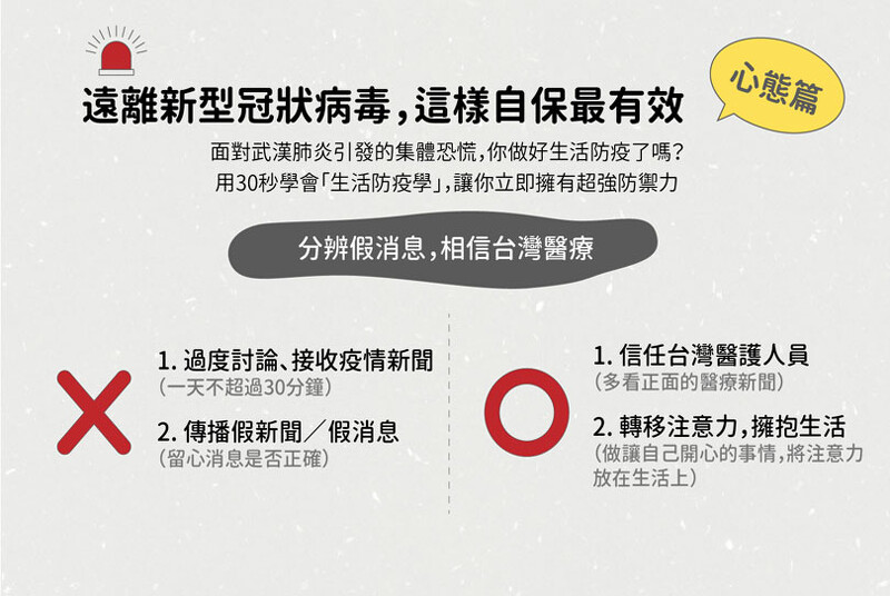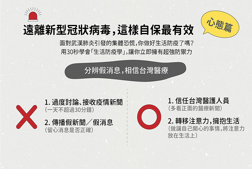 另外,林萃芬也呼籲大家多看些正面報導來排解恐懼,信任、鼓勵國內第一線的醫護、防疫人員,並對台灣的防疫能力有信心。在提高自己的「心理防疫力」後,對身旁過度恐慌的親友多點同理心,安撫他們並傳達正確資訊,不需要指責、否認對方的情緒與行為,才能有效抑制集體恐慌。
