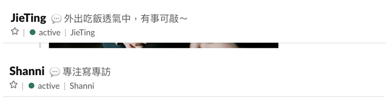 另外,你也能夠利用線上工具,讓大家了解自己目前的工作狀態,例如女人迷因為使用 slack 作為溝通工具,所以時常會利用狀態列,讓夥伴知道自己現在的工作狀態、適不適合傳私訊給對方。