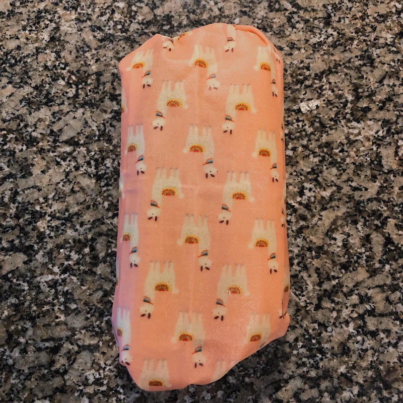 某次,我在逛聖誕市集看到一攤賣的完全不是聖誕節的相關產品,而是蜂蠟布,這是我第一次看到這個商品,老實說一開始吸引到我的是上面的羊駝圖案,讓我有動機問店家這是什麼,店家告訴我蜂蠟布可以拿來當保鮮膜保存食物,用完之後只要用有機肥皂冷水清洗,便可重複使用,千萬不能用熱水,因為這樣蜂蠟是會融化的!清洗過後也不用擰乾,直接攤開來晾乾就好。