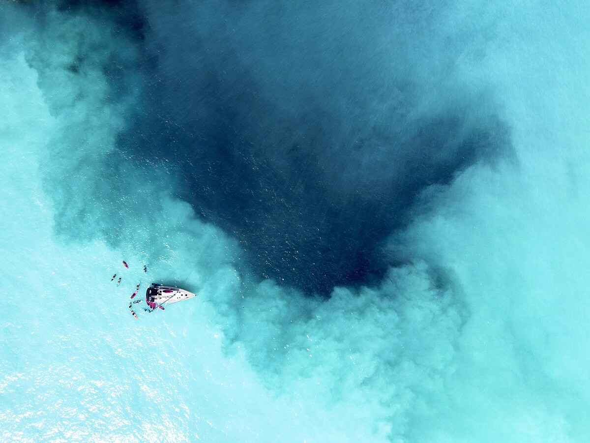 抵達龜山島外海,還沒看見傳說中的牛奶海,我們就先下船開始划SUP。划過了一個岬角,終於看到前方海平面一片夢幻的淺藍色,再靠近一點,還能看到海底火山正在噴發的海域近乎純白的顏色,慢慢往外漸層擴散,直到與一般海水交界形成美麗的暈染。划行在這一片水墨畫般的景色中,真的像在作夢一樣。