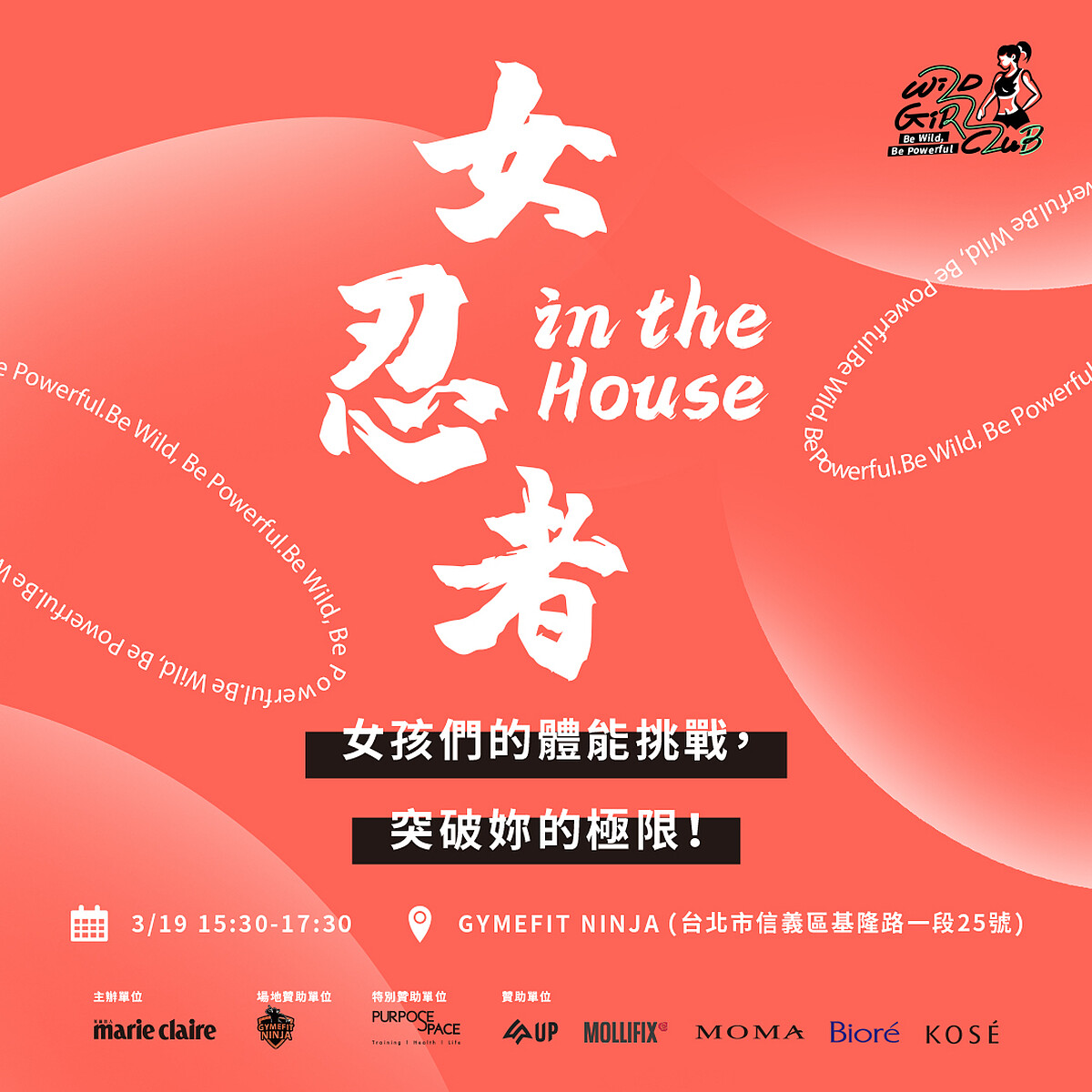 2022第一場野女孩挑戰營,將於3月19日在GYMEFIT NINJA舉辦「女忍者in the house」,邀請大家化身為一日女忍者,在汗水與體力的對抗中,突破重重關卡,不僅訓練體能,還有妳的心志!