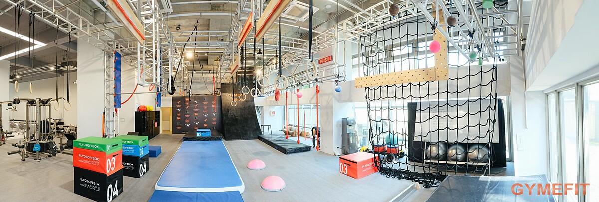 GYMEFIT NINJA忍者館除了健身房豐富多樣的訓練器材外,還有許多神秘道具:有從天而降的梯子、一整個牆面的天羅地網、各式懸掛星星、吊環、繩索…..等等裝置。
