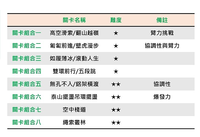 極限體能王挑戰包含:高空滑索、壁虎漫步、如履薄冰、泰山擺盪、繩索叢林…..等多道關卡,活動當天會為各位野女孩們設計組合挑戰,並安排分組對抗,增加趣味性。