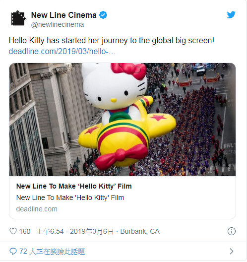 2019年3月,華納旗下的新線公司宣布,已向三麗鷗Sanrio 取得Hello Kitty的電影版權,而除了凱蒂貓外,蛋黃哥、美樂蒂和雙子星等三麗鷗旗下的角色明星,也會一同登上大螢幕。