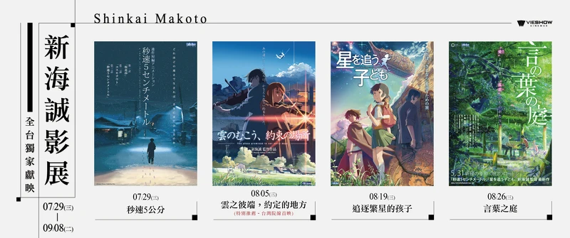 2016年,《你的名字》在日本上映,在短短半年內突破200億票房紀錄,同時也成為日本影史上票房紀錄第二、僅次於宮崎駿代表作《神隱少女》的作品。而打造該部電影的,即為近年來被譽為「新世代宮崎駿」的新海誠導演。新海誠導演享有「背景神」美譽,不僅電影畫面隨手截一幀都為美景一副,且作品人物刻畫細膩,作品動人心弦引人入勝。威秀影城將於07/29(三)起獨家於全台獻映新海誠系列電影,誠摯邀請影迷前來一同觀賞導演系列作品,欣賞導演的作品魅力。