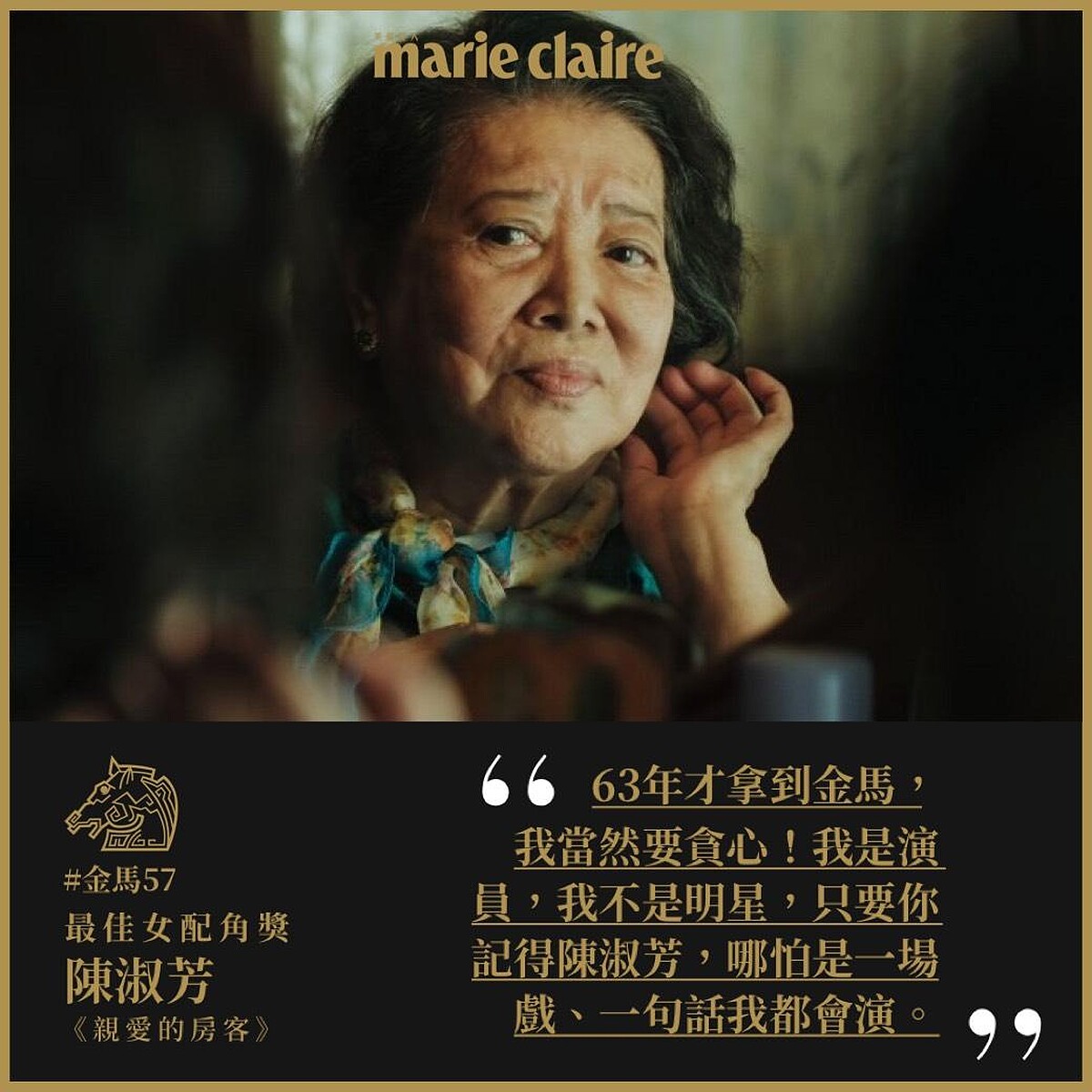 陳淑芳緊張致詞:「我真的是預料不到我會得獎,謝謝金馬、謝謝各位評委,當然我要謝謝有傑導演,有這麼好的劇本讓我來演,今年大概是我運氣比較好一點,所以就入圍這麼多,但是我不敢,因為我年紀這麼大了,騎馬一匹就夠了。但我說歸說,你們想想看,我拍戲拍了63年,第一部李泉溪導演的《誰的罪惡》,我參加過台灣省戲劇工會戲劇節,我是從國立藝專出來的,跳了一場舞就被星探帶去拍電影。63年等了這麼久,今天才拿到這一匹,我是不是可以再拿一匹?各位一定會覺得我太貪心,沒有錯!63年才拿到我當然要貪心!」