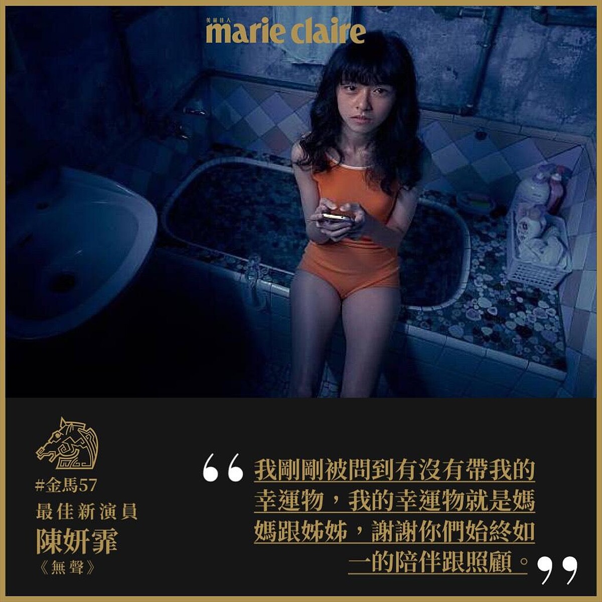 「我剛剛被問到有沒有帶我的幸運物,我的幸運物就是我媽媽跟姊姊,她們今天有來,謝謝他們。我要先跟我的化妝師說聲抱歉,我還是哭了對不起。首先我要先謝謝《無聲》的柯貞年導演還有幕前幕後的大家,讓我可以拍攝《無聲》入圍了金馬,謝謝《孤味》的承傑導演,淑芬阿嬤,以及給我非常多養分、很照顧我的前輩跟幕後的大家。謝謝我的經紀公司,謝謝把我找出來的東東跟威廉、凱翔,還有我的經紀人維尼。謝謝偉哲讓我一直寄住在他台北的家,如果在台北沒有你我真的不知道該怎麼辦。謝謝你們一直愛著我一直陪著我。最後我要感謝我的媽媽和我的姐姐,謝謝你們始終如一的陪伴跟照顧。謝謝金馬的評審老師,謝謝金馬57。」