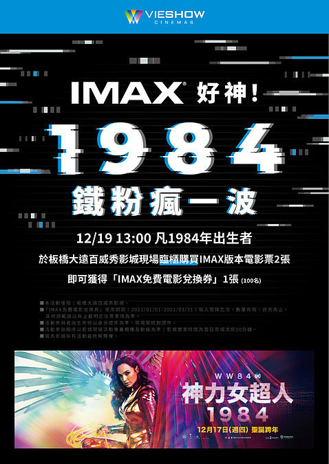 - 活動方式:凡1984年出生者、於板橋大遠百威秀影城現場臨櫃購買IMAX版本電影票2張,即可獲得「IMAX免費電影兌換券」1張 (100名)。
