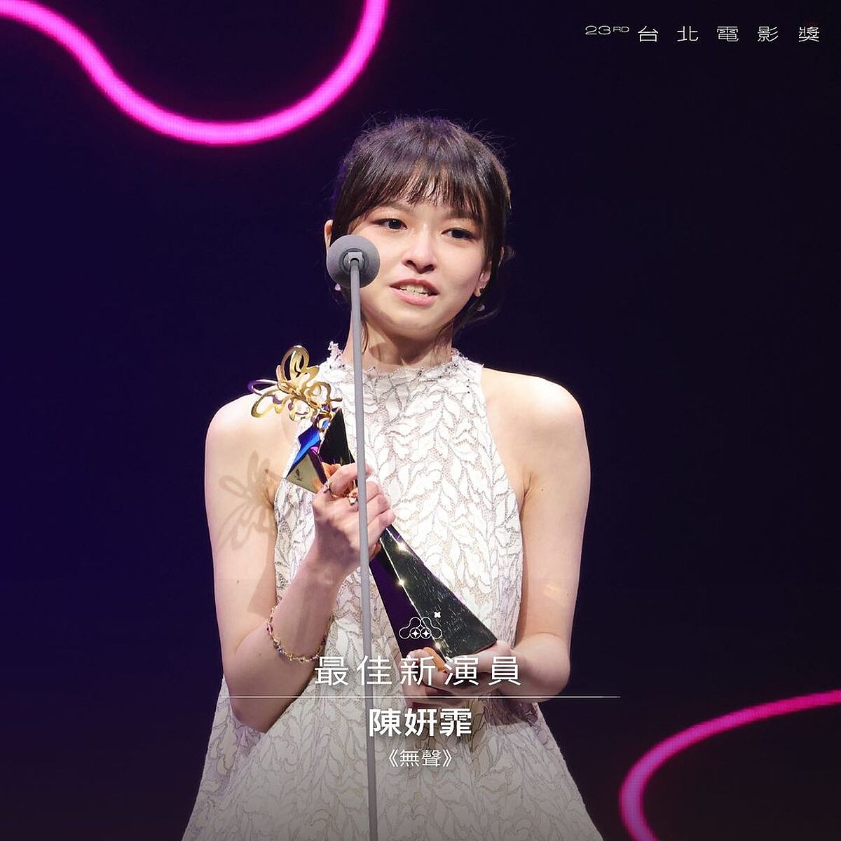 最佳新演員由《無聲》陳姸霏拿下,21歲的她去年也是金馬獎新人得主,她說:「我以為我不會這麼激動,我想謝謝柯貞年導演,監製,所有團隊,目前幕後所有人。謝謝每一個愛我的人,沒有你們沒有現在的陳姸霏。」
