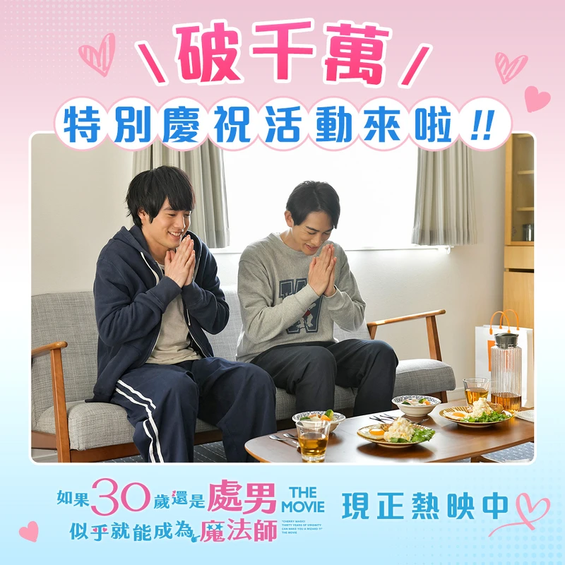 電影版《如果30歲還是處男,似乎就能成為魔法師》(通稱《電影版 櫻桃魔法》)與日本同步於4月8日在台上映後,在台灣首周末票房破新台幣370萬元,破2022年日本真人電影年度開片票房紀錄,在粉絲與觀眾的熱情支持下,目前票房已達新台幣1037萬元,並登上今年日本真人電影票房冠軍,也破近3年日本真人電影票房紀錄!為了感謝粉絲支持,電影公司車庫娛樂也特別與日本爭取一系列破千萬特別活動,除了將舉辦北中南特別場次,加碼放映日本上映紀念舞台問候影像外,更將電視版《櫻桃魔法》分為前篇與後篇,於大銀幕限定場次上映,邀請粉絲們同歡,讓大家持續徜徉在《櫻桃魔法》的魅力裡。