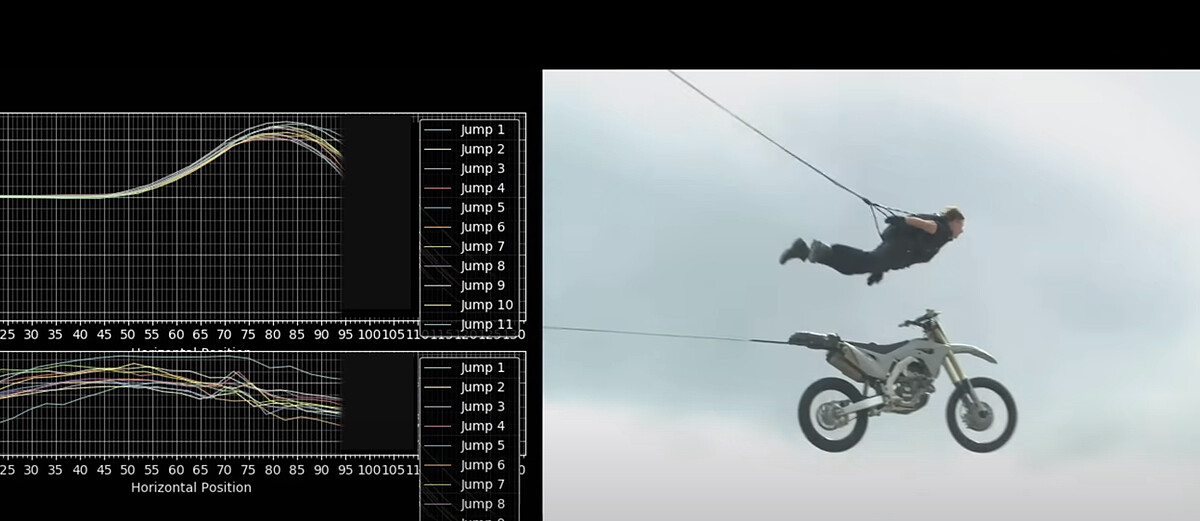 為了讓湯姆能夠模擬跳躍動作,拍攝團隊在英國的採石場搭建跳台坡道,採石場擺滿紙箱用來承接摩托車,用不同角度打造虛擬跳台坡道,精準計算湯姆應該跳躍的弧度,必須能夠固定地預測湯姆在三度空間中的位置,湯姆身上有一片GPS晶片,紀錄湯姆每一次的跳躍,加上他飆車的速度,以及當時是逆風或是側風,經過多次的測試,就能得到一致的數據,每一次拍攝都看得到他跳得多高,這樣無人機和攝影機才能在正確位置,近距離捕捉到他飛越的畫面。阿湯哥說:「特技關鍵是每一次都能達到某個速度,沒有車速表,只能靠引擎聲和感覺,當我放開摩托車,就利用迎面而來的風,再縮住胸部,就能讓我往上飛躍。」