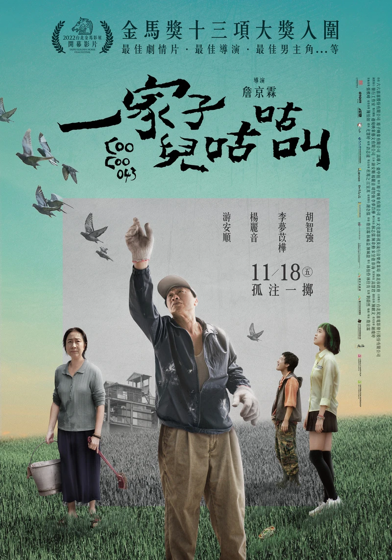 2022金馬影展開幕片《一家子兒咕咕叫》,為詹京霖導演新作,並由金鐘視帝游安順、金鐘視后楊麗音、金穗獎最佳演員胡智強和潛力新秀李夢苡樺展露精湛演技,揭開一家人的愛恨哀愁。作品多關注台灣社會底層人物生活的詹京霖,曾以《狀況排除》與《川流之島》入圍金馬獎最佳短片及新導演。第二部長片《一家子兒咕咕叫》也曾入選2021金馬創投會議WIP企劃案,更一舉入圍本屆金馬獎最佳劇情片、導演、男主角、男女配角、最佳新演員、最佳原著劇本、最佳美術設計、最佳造型設計、最佳原創電影音樂、最佳剪輯、最佳音效等13項大獎。不僅獲得第59屆金馬最大獎項「最佳劇情片」,胡智強也獲得了「最佳新人」的獎項而激動的淚流滿面。