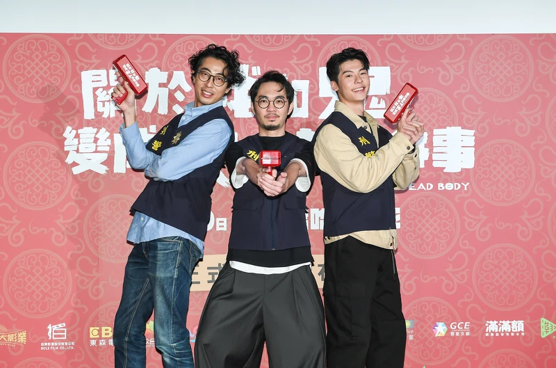 《關於我和鬼變成家人的那件事》正式海報中,許光漢、林柏宏、王淨三位高顏值主角站在中央,仔細看發現林柏宏下半身失蹤漂浮在許光漢背後,還手持線香品嚐,符合兩人電影裡「冥婚」的搞笑設定。