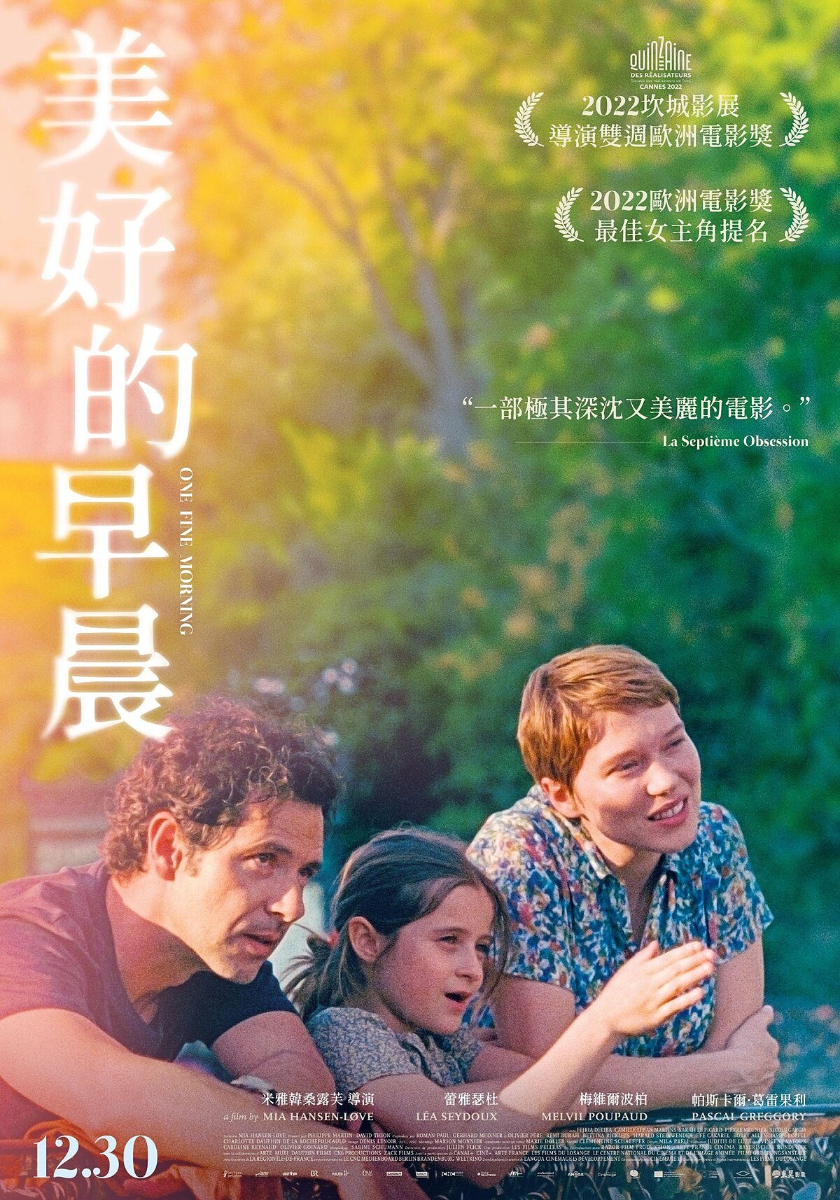 《美好的早晨》榮獲2022坎城影展導演雙週歐洲電影獎,法國才女導演米雅韓桑露芙(Mia Hansen-Løve)繼《柏格曼的島》再次帶來一段關於愛與失去的故事,全片灑落著散文式優美的悸動與詩意光彩,搭配英國歌手Bill Fay直搗心扉的神曲〈Love Will Remain〉,既傷感又充滿力量。電影取材自導演本身經歷,從哲學家父親的失智症中體會生命的重量,再從變動的世界中尋找靈魂深處的光明。韓桑露芙更以她慣用的35釐米攝影機進行拍攝,賦予巴黎和電影中難解的課題一股視覺與心靈上的溫柔感。