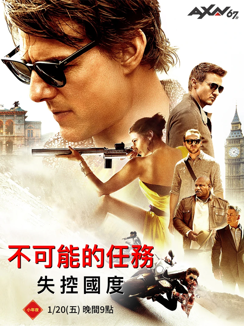 於2015年上映的《不可能的任務:失控國度》首度在AXN頻道播出,故事主要講述中央情報局看不慣臥底任務組織「不可能任務情報局(IMF)」的行事作風,決意關閉不可能任務情報局。在團隊陷入解散危機之時,探員伊森韓特(湯姆克魯斯 飾)發現國際恐怖組織「辛迪加」意圖破壞文明世界基礎。面對團隊命運岌岌可危與恐怖組織一連串的威脅,伊森韓特決定集結團隊全力追緝恐怖組織,用盡手段完成間諜生涯中最艱鉅的不可能任務!