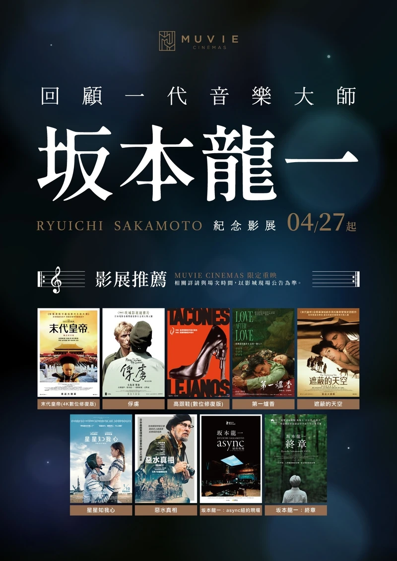 回顧坂本龍一的一生,他的身分相當多元,不但為電影作曲,也親自上陣演戲,影史經典《俘虜》開啟坂本龍一的電影配樂生涯,更憑藉電影《末代皇帝》榮獲第60屆奧斯卡最佳原創電影配樂,這兩部坂本龍一的最具代表性的經典之作,與他所操刀配樂榮獲第47屆金球獎最佳原創配樂獎電影《遮蔽的天空》,和榮獲第40屆香港電影金像獎最佳配樂獎的《第一爐香》,以及《高跟鞋》《星星知我心》《惡水真相》《坂本龍一:終章》《坂本龍一:async 紐約現場》等片,即將於4月27日至5月11日於威秀影城舉行【坂本龍一紀念影展】重新上映,MUVIE CINEMAS率先公布4月29日特別場,並將陸續上映大師作品,再一次透過大銀幕回顧與緬懷,看見與聆聽永恆經典的大師精神!