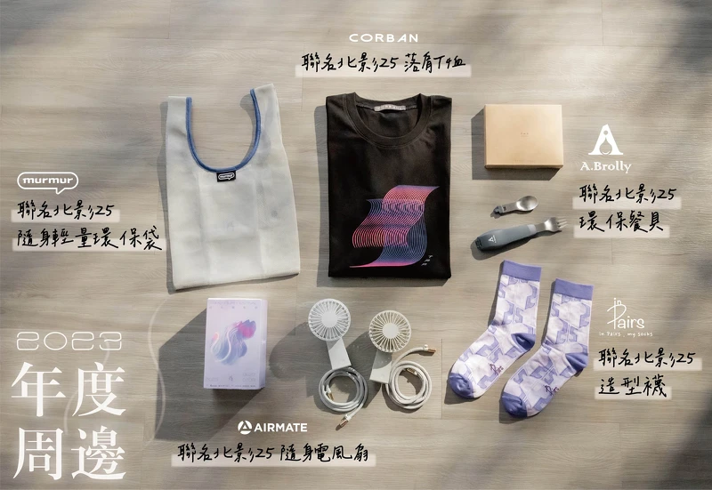 第25屆台北電影節主視覺經典款系列商品,再次與台灣在地優質品牌聯名,共同推出murmur聯名北影25隨身輕量環保袋、A.Brolly亞伯尼聯名北影25環保餐具、CORBAN聯名北影25落肩T恤、AIRMATE艾美特聯名北影25隨身電風扇、in pairs聯名北影25造型襪,輕柔、半透明的藍紫色蝶蛹結合5款商品,一曝光就讓網友直呼「超有質感」,一定要帶回家收藏。