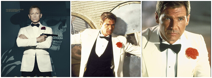 由於導演史蒂芬史匹柏一直很想拍龐德電影過癮,於是在第二集《魔宮傳奇》的開頭場景,就出現了穿白西裝打黑啾啾蝴蝶結,口袋還插上康乃馨的印第安那瓊斯奇妙場景。