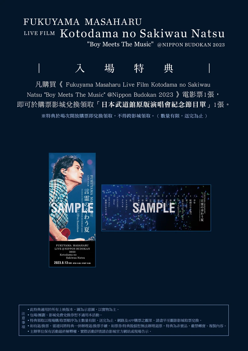 公布的電影入場特典「日本武道館原版演唱會紀念節目單」,正面為福山雅治彈著吉他的圖像以及電影拍攝的2023年8月13日演唱會表演現場的日期和時間,給粉絲們一種參加現場演場會紀念門票的感覺;背面則是演唱會電影的演出曲目,包括了福山雅治為電影所挑選的名曲〈零 -ZERO-〉〈虹〉〈Squall〉〈想望〉等。戲院贈送方式:凡購買《Fukuyama Masaharu Live Film Kotodama no Sakiwau Natsu "Boy Meets The Music" @Nippon Budokan 2023》電影票1張,即可於購票影城兌換領取「日本武道館原版演唱會紀念節目單」1張。