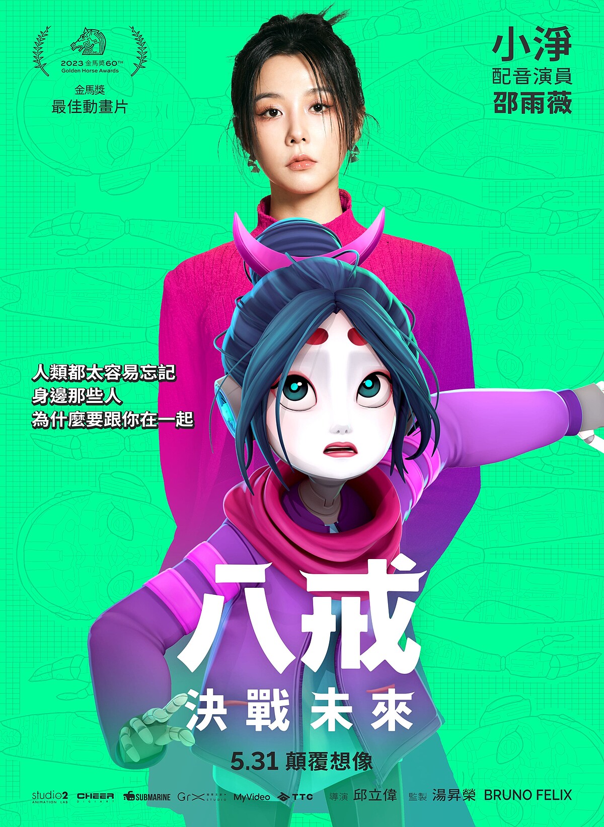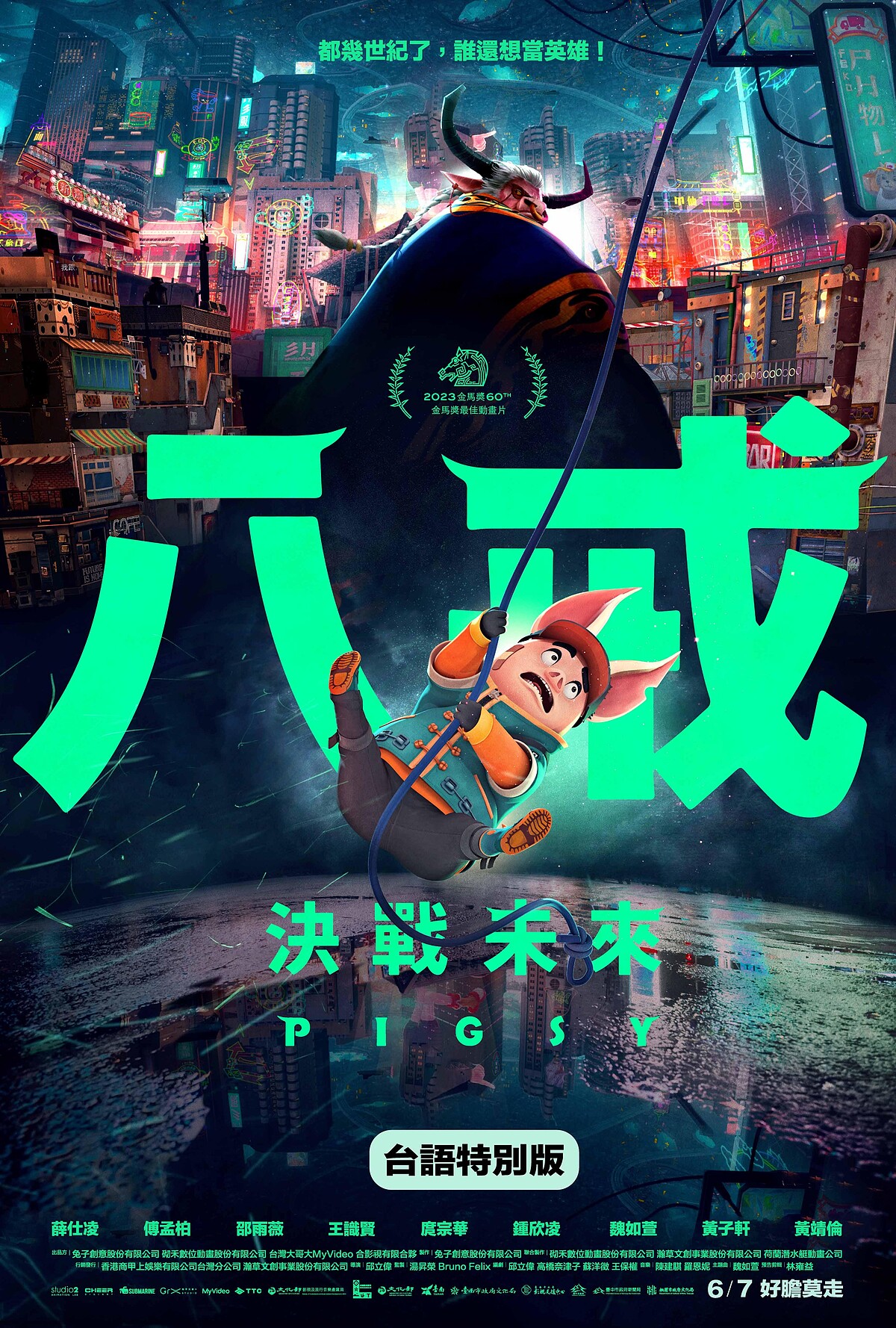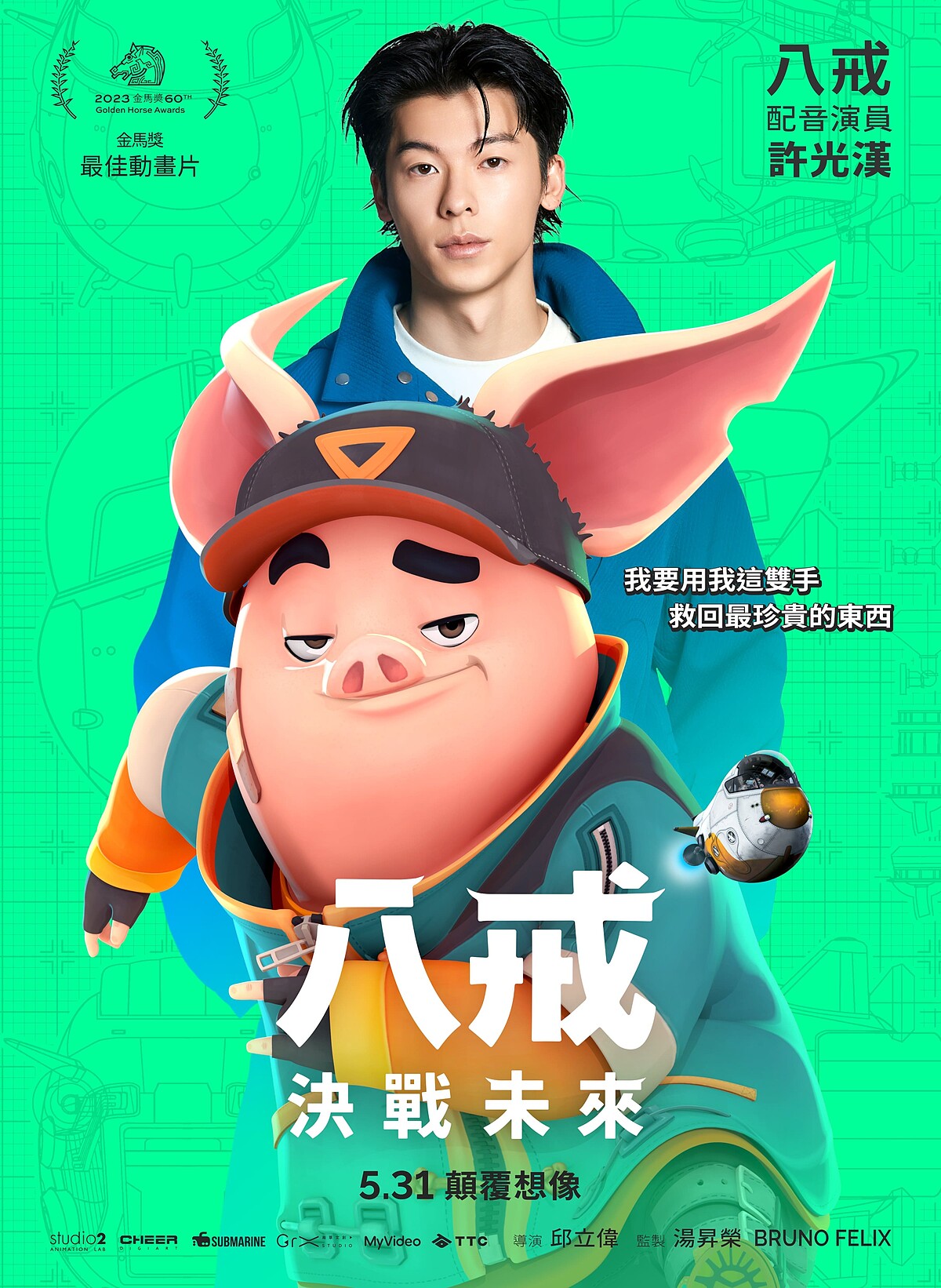 《八戒》更是破天荒集結史上最華麗全明星配音陣容,許光漢化「聲」主角「最帥八戒」,搭檔「理工男三藏」劉冠廷,並與庾澄慶、邵雨薇、庹宗華、許展榮、許展瑞、鍾欣凌、魏如萱獻聲飆戲。《八戒》:決戰未來,故事劇情描寫科技與數據主宰一切的未來世界,舊城區人人嚮往移居以最新科技打造的「新世界」,然而唯有貢獻值最高的菁英,才有資格入住。八戒(許光漢 配音)是一個擁有街頭智慧卻常搞砸事情的魯蛇,為了讓奶奶(鍾欣凌 配音)到新世界過上好日子,違背良心與建商總裁牛魔王(庹宗華 配音)私下進行交易……。片中由賽博胖客八戒擔綱故事主角,與理工男三藏(劉冠廷 配音)、火爆護衛悟空(庾澄慶 配音)、女機器人小淨(邵雨薇 配音),在未來世界冒險過程中找到屬於自己的幸福真諦。