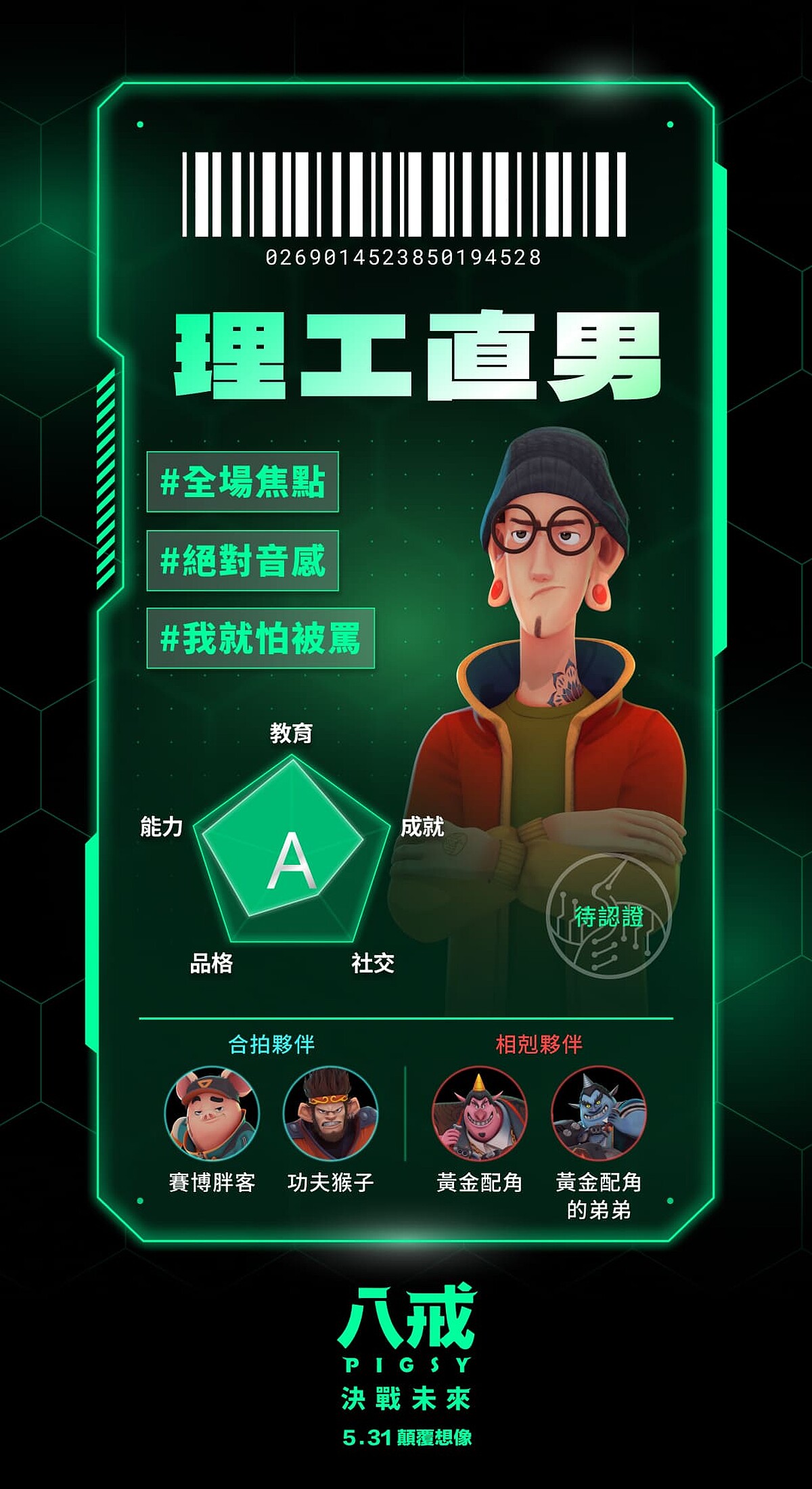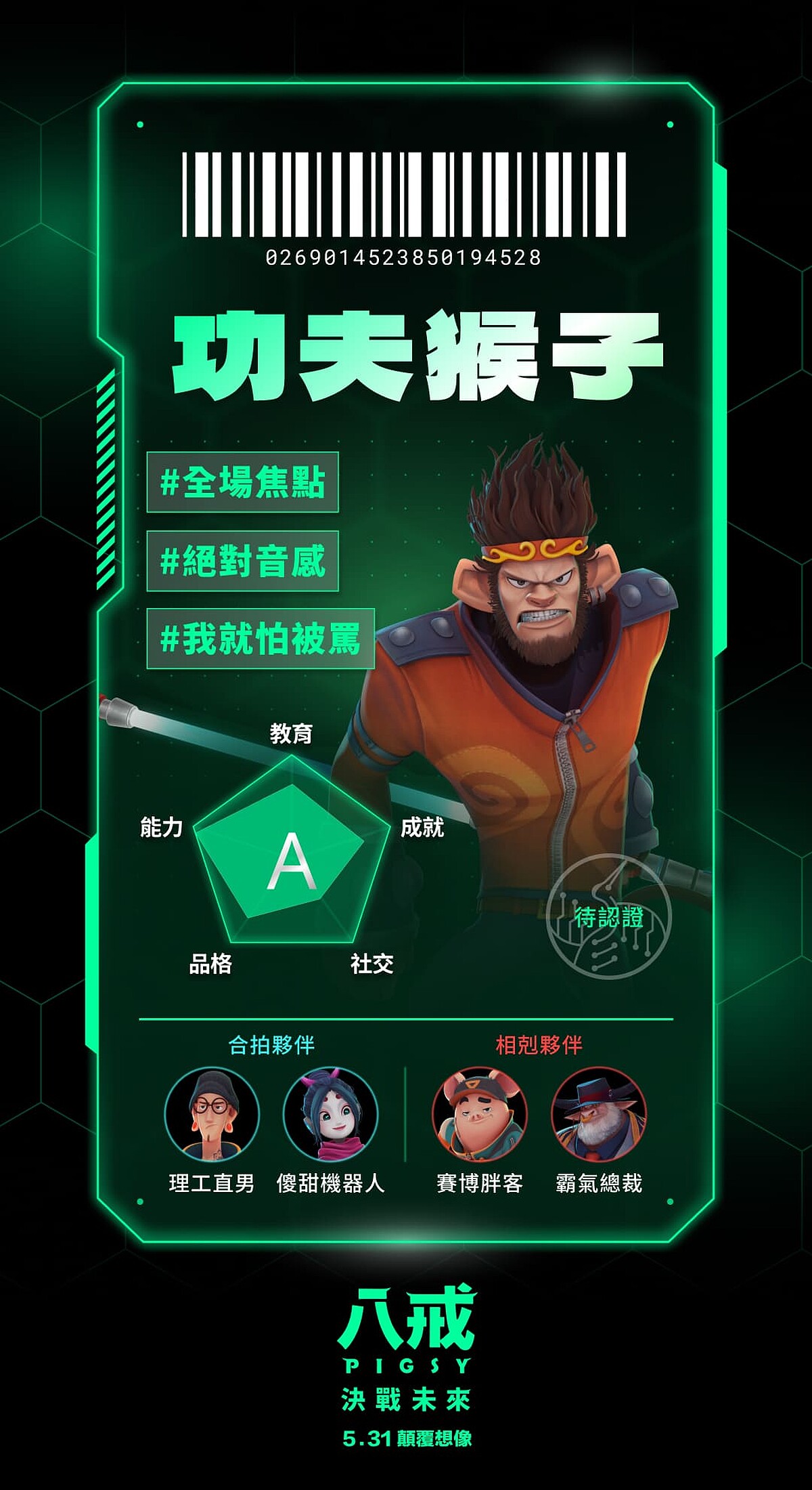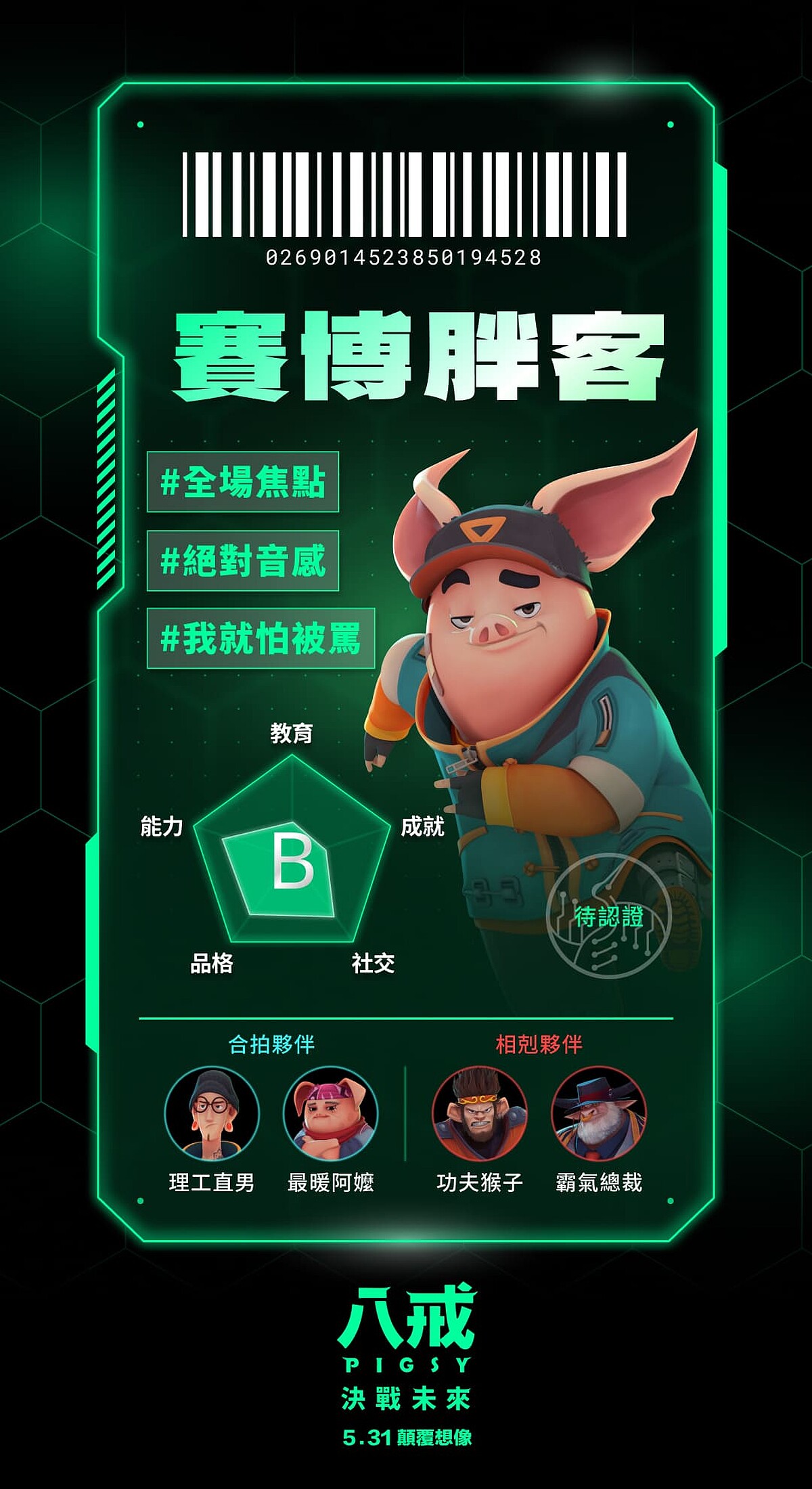 《八戒》更是破天荒集結史上最華麗全明星配音陣容,許光漢化「聲」主角「最帥八戒」,搭檔「理工男三藏」劉冠廷,並與庾澄慶、邵雨薇、庹宗華、許展榮、許展瑞、鍾欣凌、魏如萱獻聲飆戲。《八戒》:決戰未來,故事劇情描寫科技與數據主宰一切的未來世界,舊城區人人嚮往移居以最新科技打造的「新世界」,然而唯有貢獻值最高的菁英,才有資格入住。八戒(許光漢 配音)是一個擁有街頭智慧卻常搞砸事情的魯蛇,為了讓奶奶(鍾欣凌 配音)到新世界過上好日子,違背良心與建商總裁牛魔王(庹宗華 配音)私下進行交易……。片中由賽博胖客八戒擔綱故事主角,與理工男三藏(劉冠廷 配音)、火爆護衛悟空(庾澄慶 配音)、女機器人小淨(邵雨薇 配音),在未來世界冒險過程中找到屬於自己的幸福真諦。