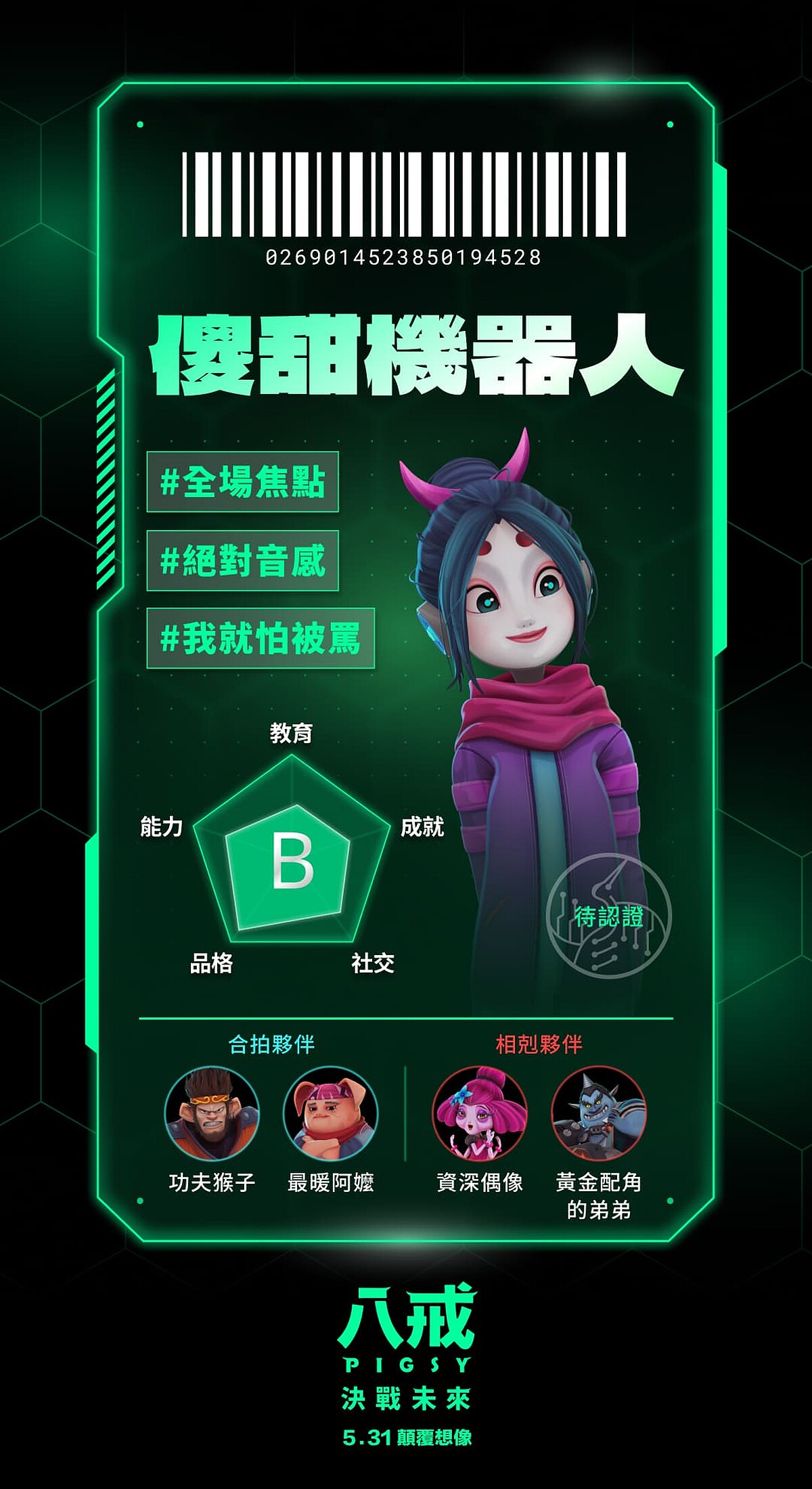 《八戒》花絮片中更搶先曝光邵雨薇聲演的機器人女孩「小淨」有著悲慘身世,她是照護型機器人,曾經服務一個家庭,卻因為這家人要前往「新世界」而被狠心拋棄,只能四處流浪,最後住在廢棄的資源回收中心,所幸遇見許光漢、劉冠廷、庾澄慶一行人,才重獲新生,和三人展開冒險,讓人相當好奇接下來的發展。