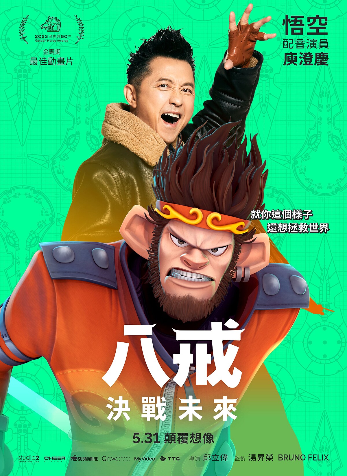 這次聲演孫悟空的庾澄慶曾為《玩具總動員》胡迪一角配音,成為許多人的童年回憶,監製湯昇榮和導演邱立偉表示:「我們在最後一刻想到可以邀請哈林哥,問過他的意見,哈林哥二話不說就指定配音悟空,還說要做“潑猴”悟空!音樂總監陳建騏因為哈林哥加盟,為他精心設計電吉他配樂。」看得出庾澄慶配音不忘燃燒搖滾歌手魂,預告影片也搶先曝光未來城市樣貌、飛行器空戰,「悟空」庾澄慶與「牛魔王」將決一死戰,畫面熱血沸騰。
