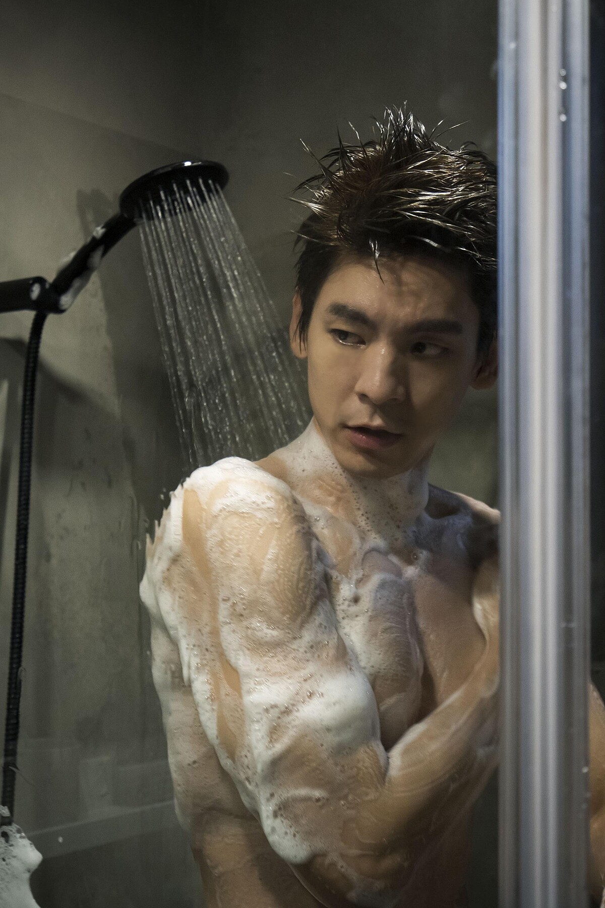 上一回曾在《怪胎》裡演繹強迫症,淋浴時拿刷子刷自己的身體;這一次在《愛的噩夢》,林柏宏因另一半的潔癖規定,再度裸身入鏡,大秀冰塊肌。不過,他開玩笑說:「這次淋浴有霧氣,可能不會被看得那麼清楚,所以壓力就沒這麼大。」