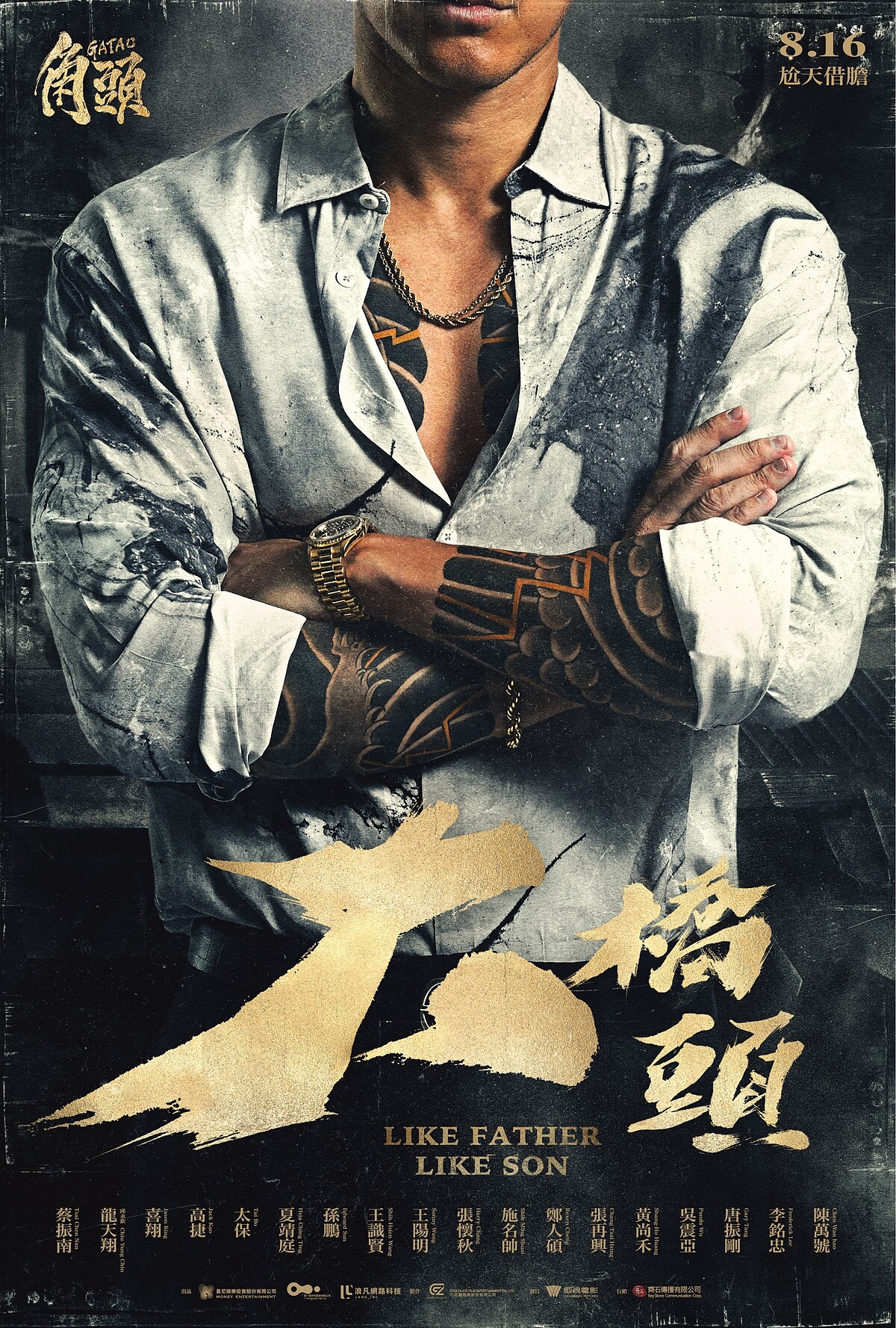 在《角頭-大橋頭》首張海報跟以往大眾對於角頭兄弟既定的「一身黑」形象不太一樣,身上穿著一件頗有時尚感的水墨白色花襯衫,微開的領口及捲起的袖子,露出胸口及手臂上海浪圖騰刺青,閃電符號在刺青中若隱若現,即是《角頭》首集的王陽明。
